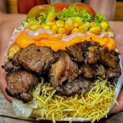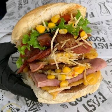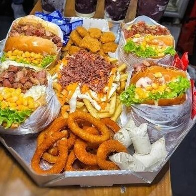 Pão, 2 Carnes, 2 Queijos e 2 Presuntos, 2 Ovos, Calabresa, Bacon, Frango, Milho, Batata palha, Alface e Tomate