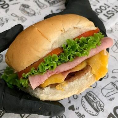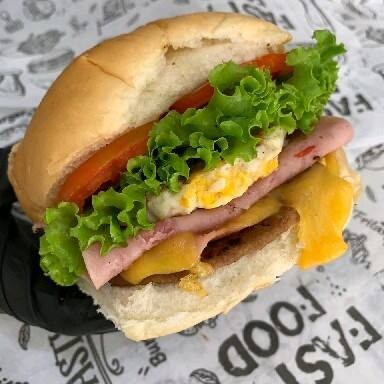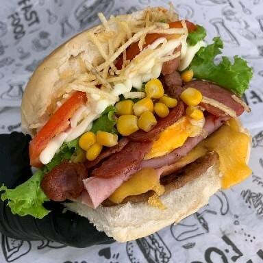 Pão de hambúrguer, carne, presunto, mussarela, ovo, tomate, milho, alface, molho rosê e batata