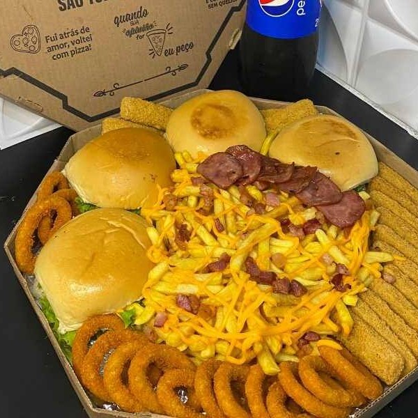 são 5 Da Casa + 10 Cebolas + 10 nuggts + Batata frita com cheddar e bastante calabresa + refri de 2 litros + molhos