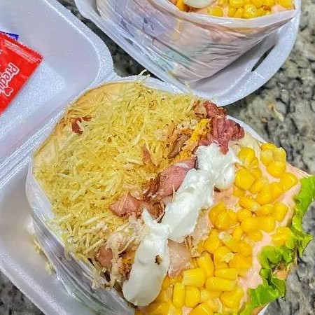 Pão, 2 carnes, presunto, 100g de contra file em tiras, queijo mussarela, Catupiry, ovo, alface americano, tomate, milho, batata palha, molho rose da casa