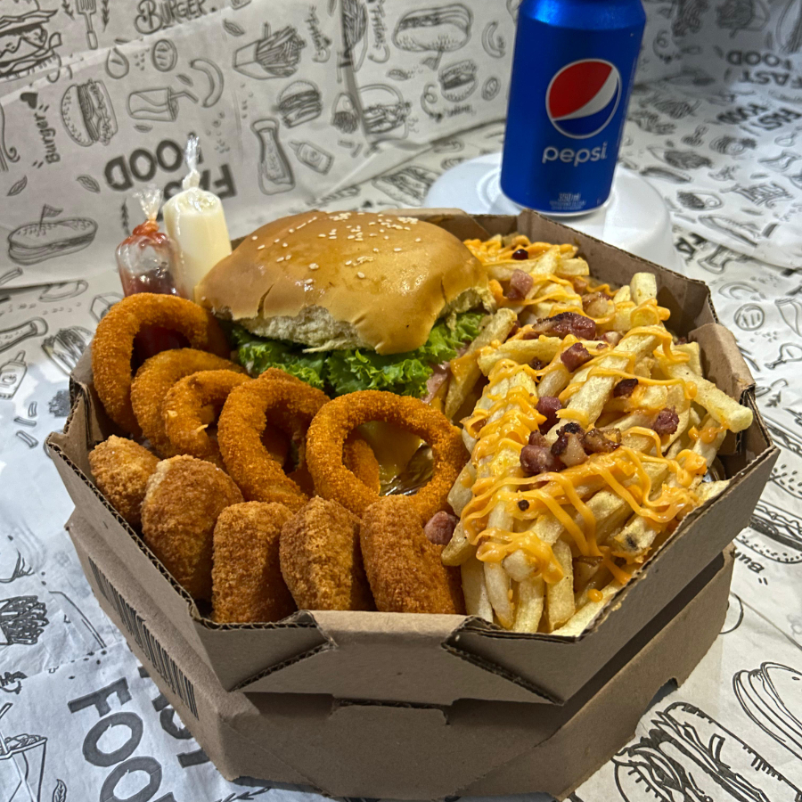 1 X-Burguer + Batata Frita + 5 Anéis De Cebola Fritos + 5 Nugget + Bacon Com Chedda + Refrigerante lata