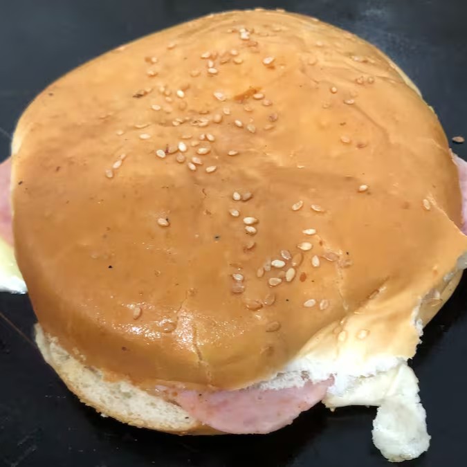 Pão com gergelim, ovo, queijo, presunto, tomate e molho.