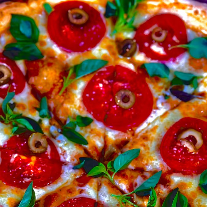 Massa especial fresca ,molho do chef, mussarela, tomate, manjericao, azeitonas, orégano e parmesão