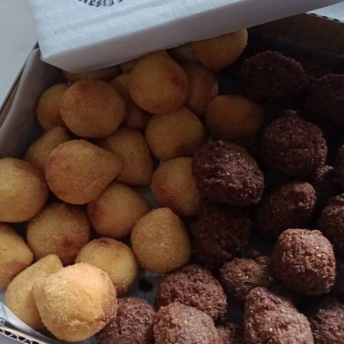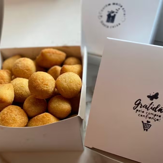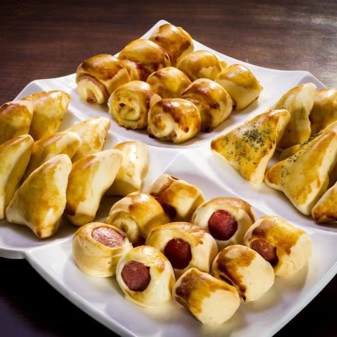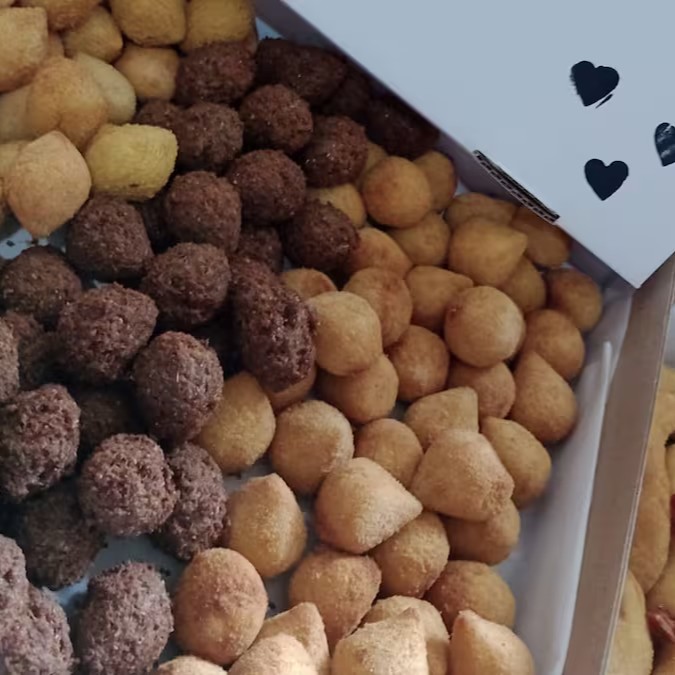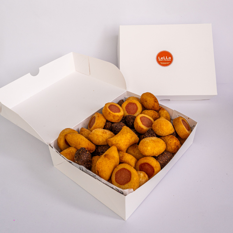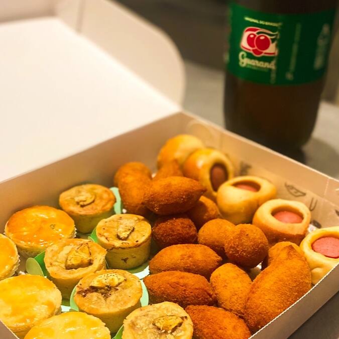 Entre os sabores disponíveis temos coxinha de frango, quibe, bolinhas de queijo, travesseirinho de calabresa, enroladinho de salsicha, croquete pizza e croquete de carne seca.