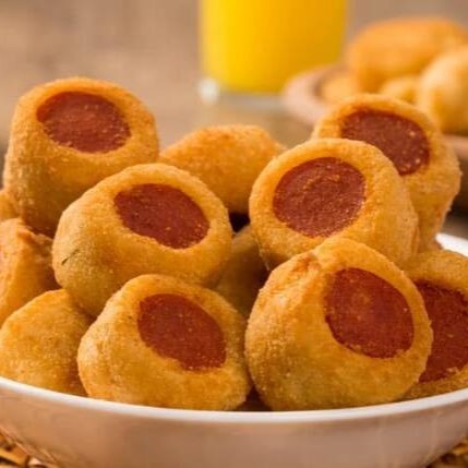 Croquete de salsicha frito, em torno de 20g cada.