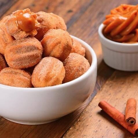 Delicioso mini churros de doce de leite frito na hora, quentinho, com quele gostinho de canela irresistível!