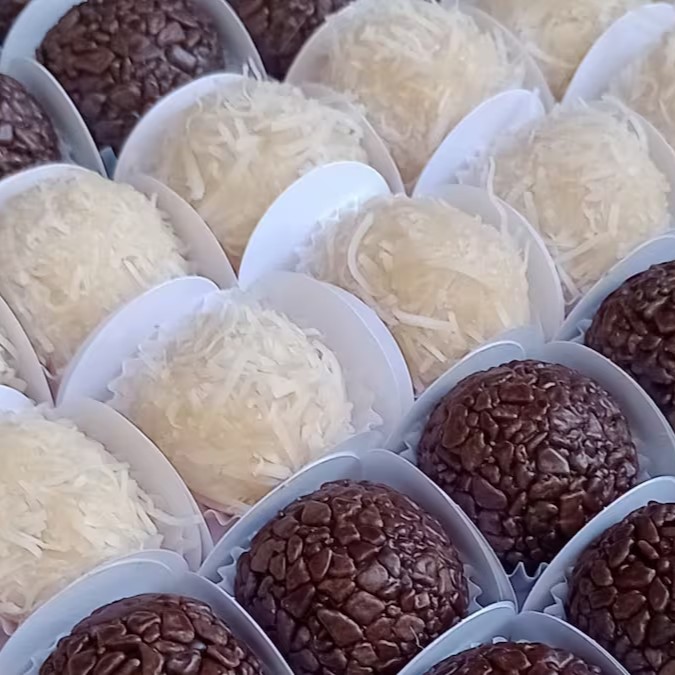 Docinhos artesanais com ingredientes de qualidade e gostinho de feito em casa, com em média 16g cada. Brigadeiros de chocolate e beijinho de coco, embalados em bercinhos, prontos pra um evento! Perfeito para presentear alguém!
