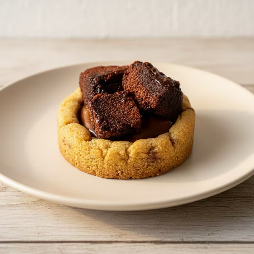 Tartelete deliciosa com massa de cookie crocante, recheio generoso de Nutella e cubinhos de Fondant Baulois (Tipo brownie macio e fudgy). Uma explosão de sabores para você se deliciar!
