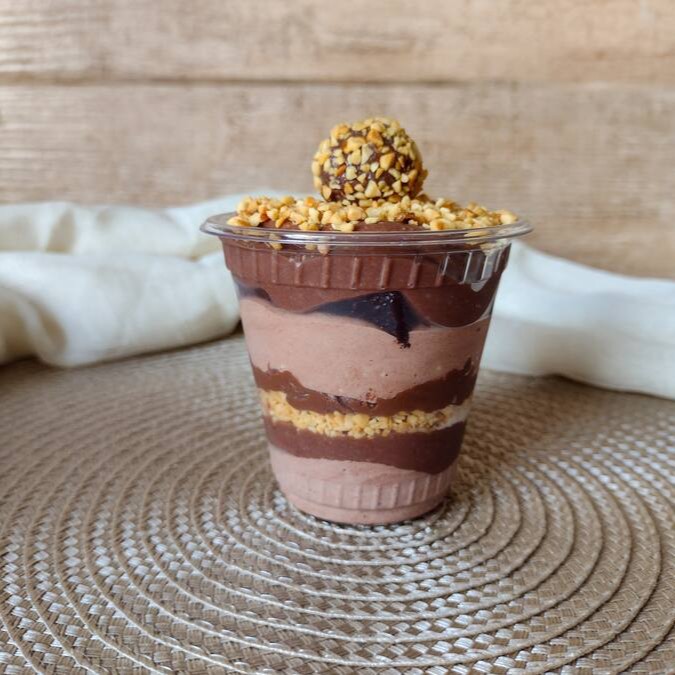 Esse copo da felicidade é uma explosão de sabor, temos nesse um mousse de chocolate leve e saboroso, brigadeiro ao leite extremamente cremoso, pedaços de brownie, amendoim em grânulos, finalizado com amendoim e brigadeiro. Aprox. 250grs (tamanho M).