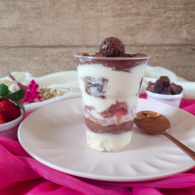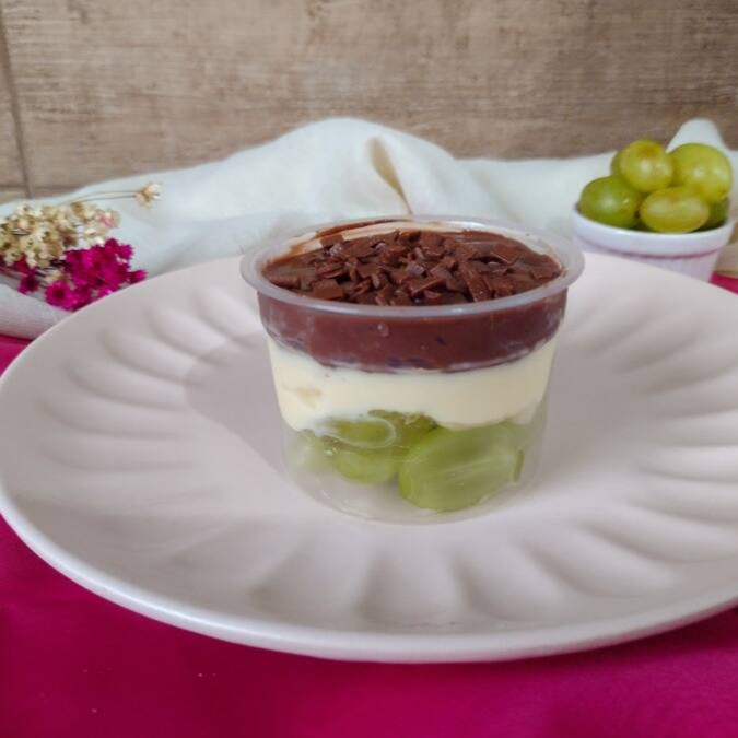 Cremosidade e sabor em cada camada! Nossa sobremesa de uvas frescas sem caroço, creme de Ninho e um irresistível creme de chocolate na cobertura, finalizada com granulado de chocolate.