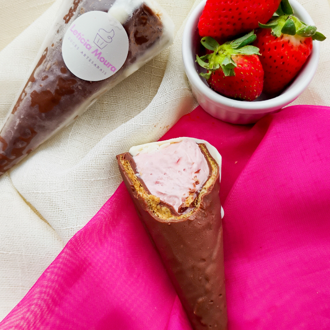 Nosso creme gelado ultra cremoso servido no cone crocante. Uma sobremesa delicada, elegante e simplesmente viciante. Gelato de morango equilíbrio perfeito com pedaços de morango, finalizado com chocolate. Banhado no chocolate nobre. Peso médio 66gr. Tags: promoção, oferta, melhor bolo no pote, doce, sobremesa, chocolate, entrega rápida, comemoração, doce, prestigio, coco, bolo de chocolate, gratis, gratuito, pote da felicidade, torta, fatia, fatia de bolo, fatia de torta, chocolate ao leite, sorvete, picole, sorvete na casquinha