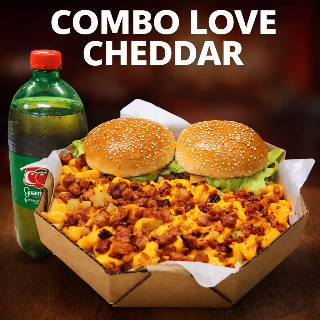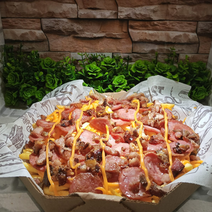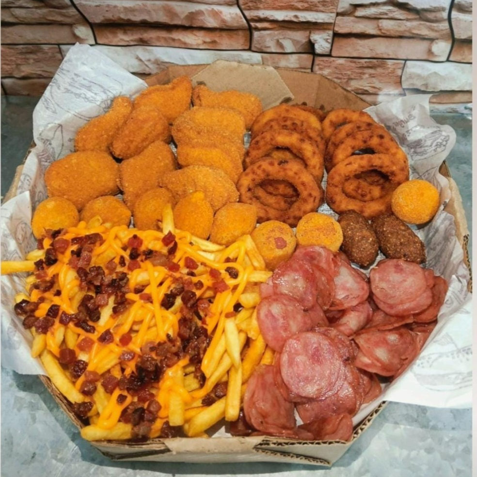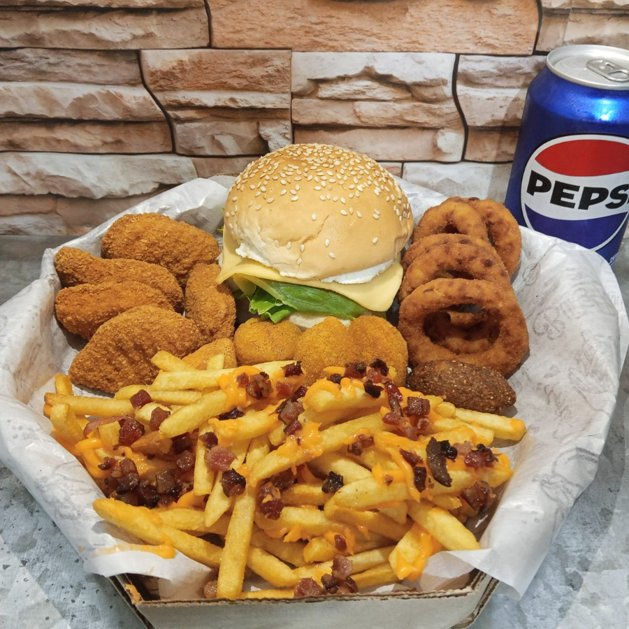 Esse delicioso combo e composto por um Hamburguer, 200 grama de batata(pesada antes de ser frita)adicionado de cheddar e bacon,5 Aneis de cebola,5 Salgadinhos,5 Nuggets,e 1 Refrigerante lata