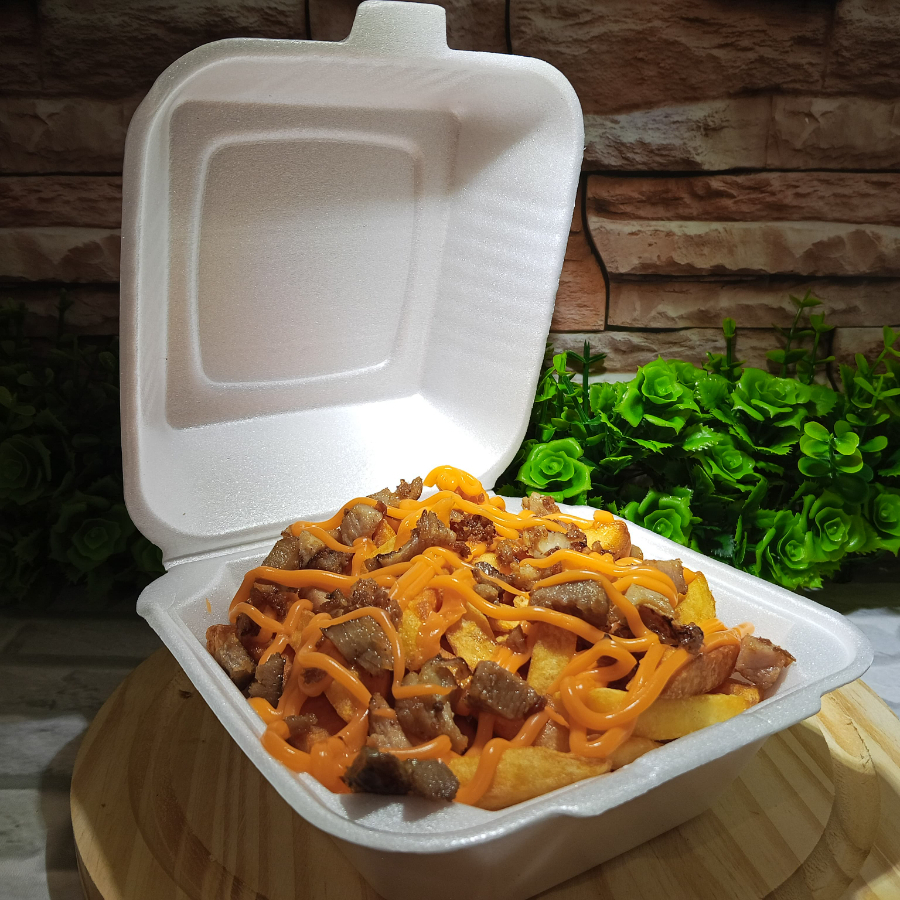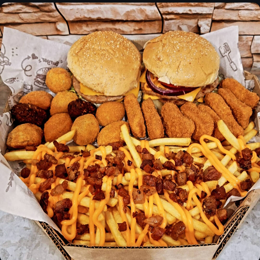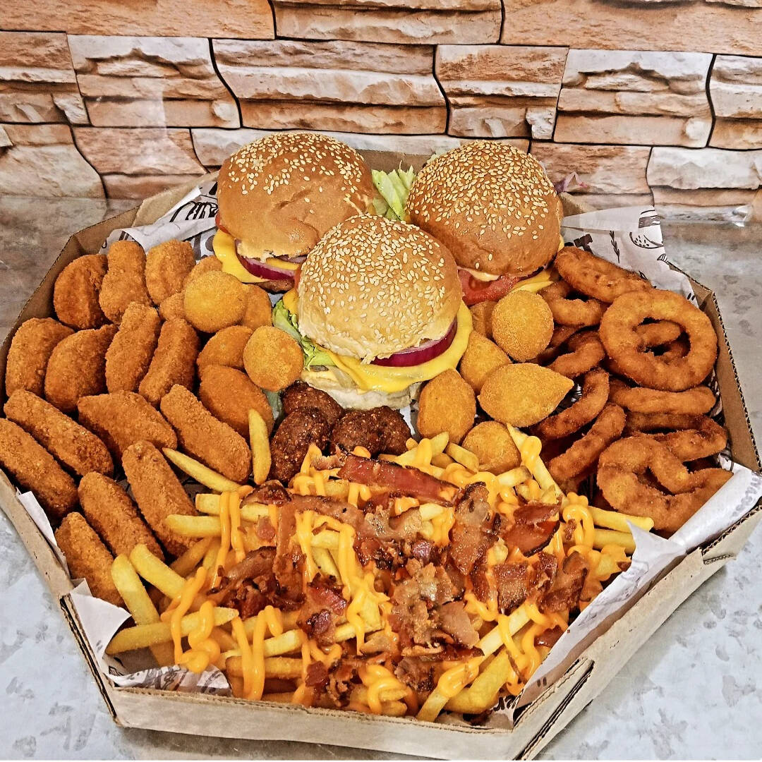 Esse delicioso combo e composto por um Hamburguer, 200 grama de batata(pesada antes de ser frita)adicionado de cheddar e bacon,5 Aneis de cebola,5 Salgadinhos,5 Nuggets,e 1 Refrigerante lata