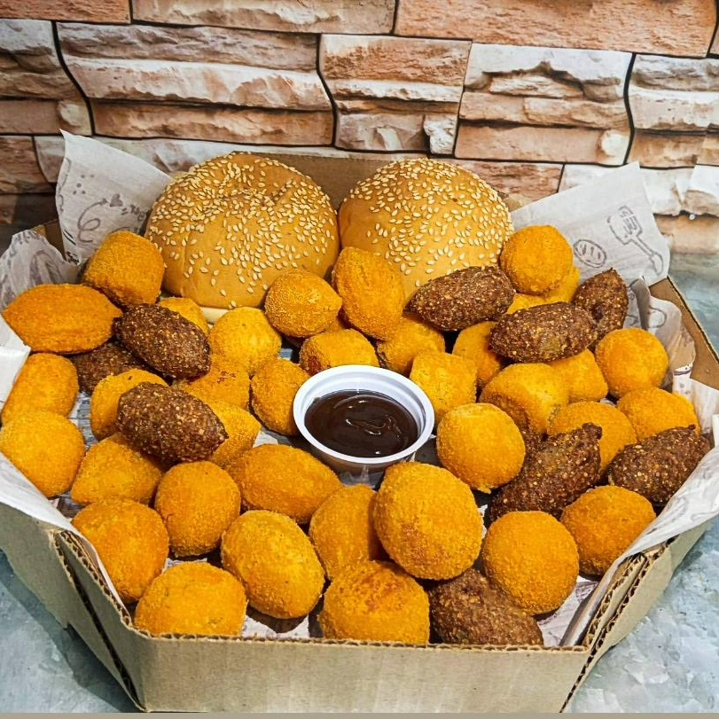 Esse delicioso Combo e composto por 2 Hamburgues,e 50 deliciosos salgadinhos Misto de 20 gramas e acompanhar molho Barbecue