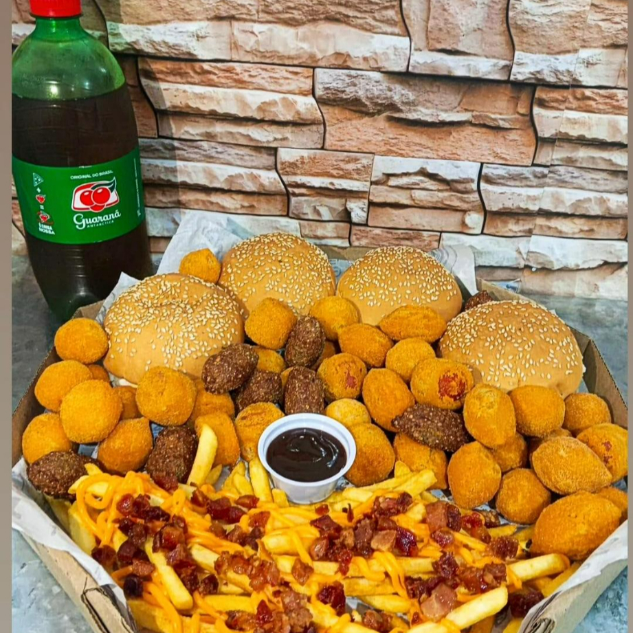 3 X-burguer, 15 Anéis de Cebola, 15 salgados misto, 15 Nuggets, 1 Batata M com Bacon e Cheddar, 1 Guaraná antártica de 1 litro
