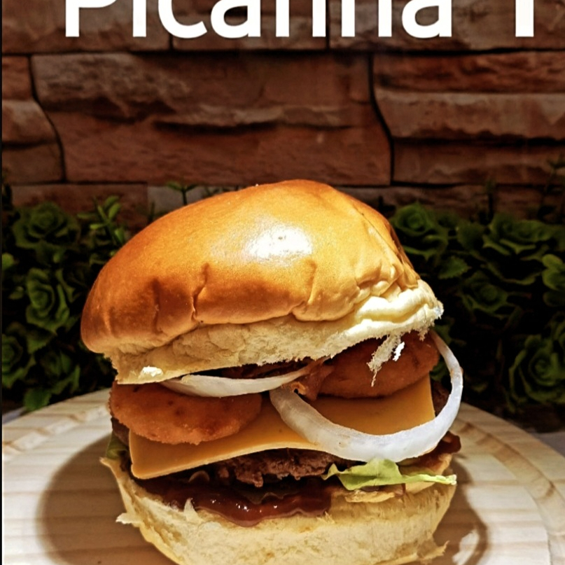 Pão de brioche, 1 carne de picanha de 120 gramas, 1 fatia de queijo, anéis de cebola, salada e molho da casa