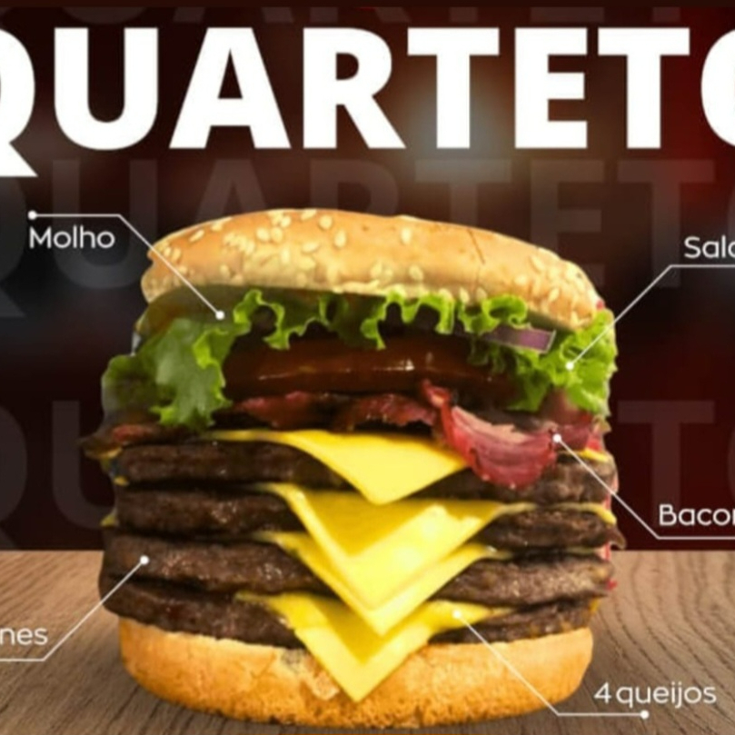 Pão de gergelim, 4 carnes, 4 fatias de queijo, bacon, salada e molho da casa