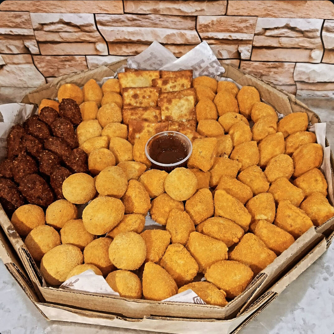 São 100 deliciosos Salgadinhos Misto,(Bolinha de queijo,queijo com presunto,pizza,coxinha,kibe,salsicha