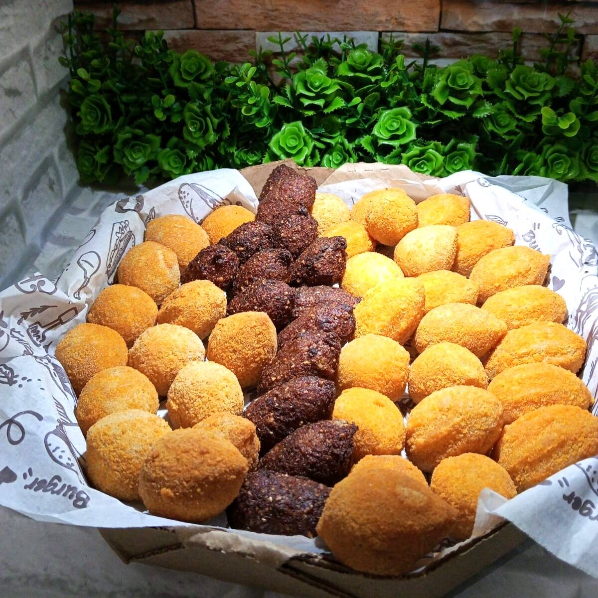 São 50 deliciosos salgadinhos misto 20 grama cada(coxinha,bolinha de queijo,kibe ,queijo com presunto,pizza