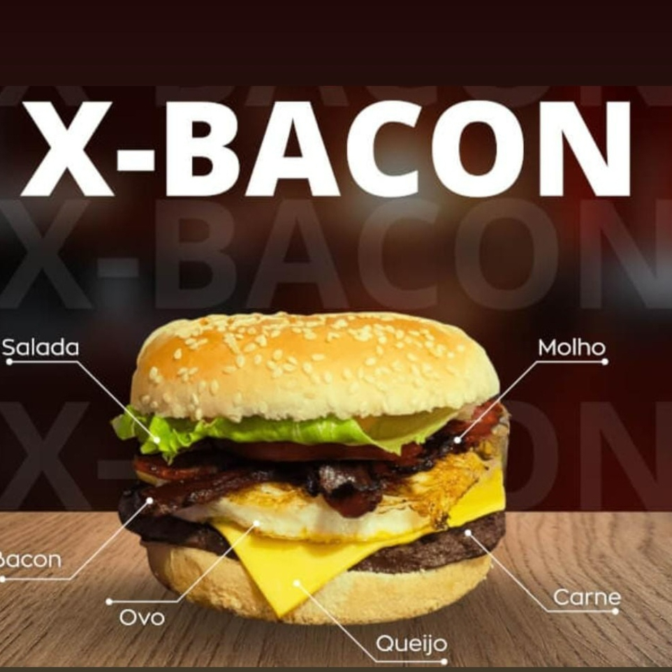 Pão de gergelim, 1 carne, 1 fatia de queijo, bacon, 1 ovo, salada e molho da casa