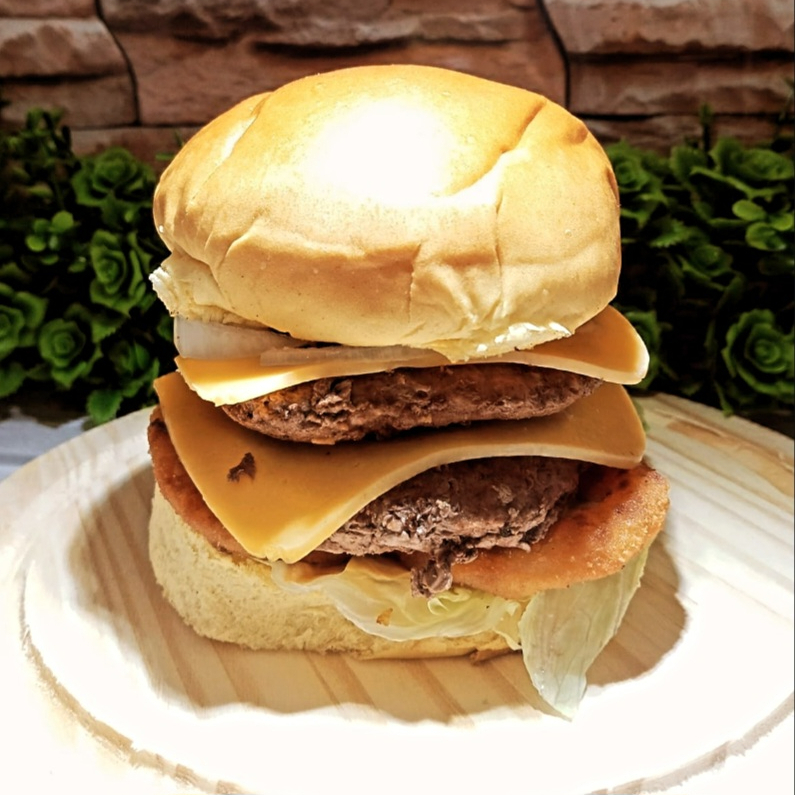 Pão de gergelim, 2 carnes, 2 ovos, 2 fatias de queijo, salada, molho da casa e batata frita