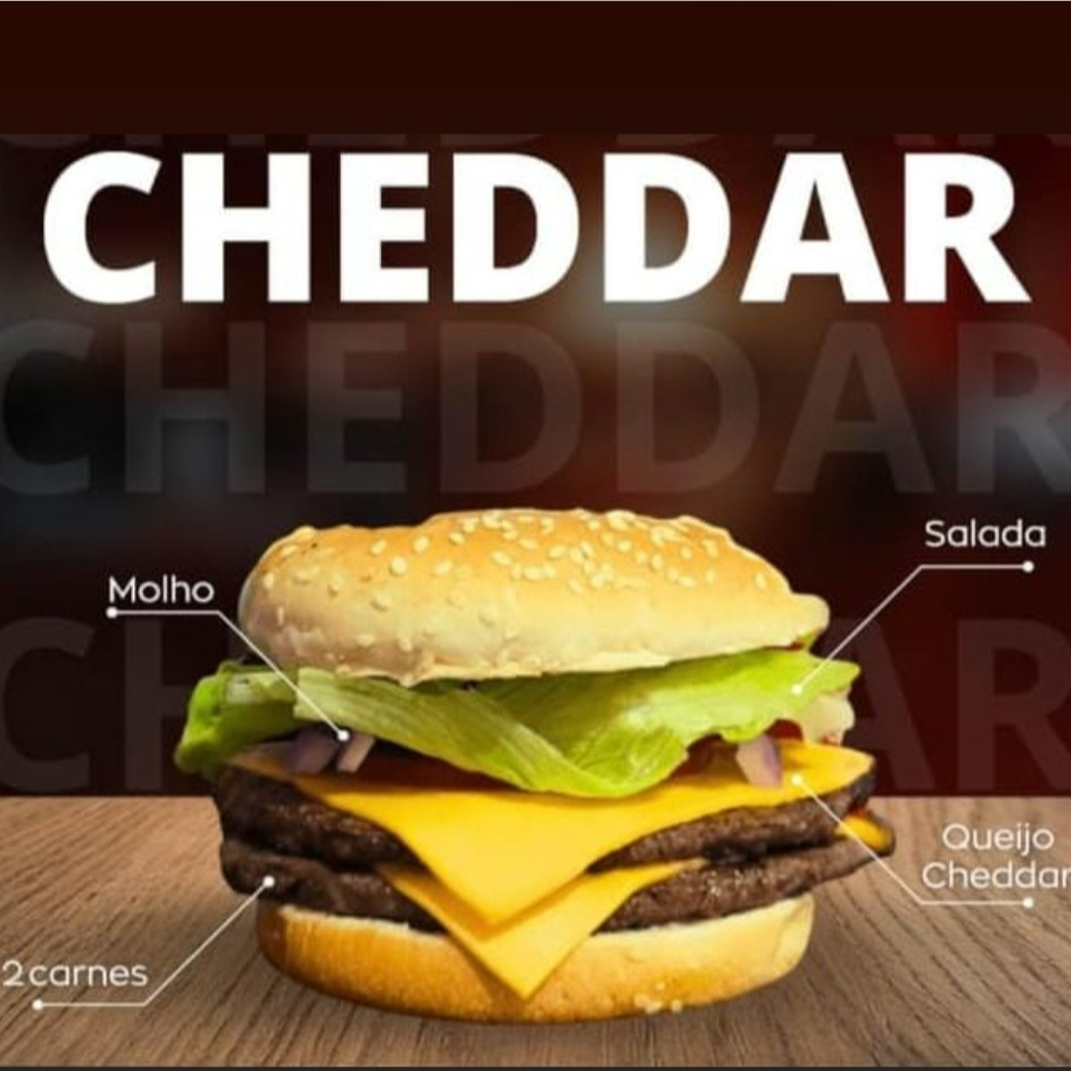 Pão de gergelim, 2 carnes, 2 fatias de queijo cheddar, salada e molho cheddar
