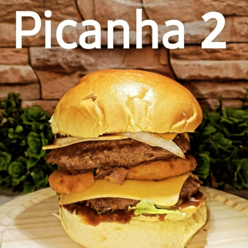 Pão de brioche, 2 carnes de picanha 120 gramas cada, 2 fatias de queijo, anéis de cebola, salada e molho da casa