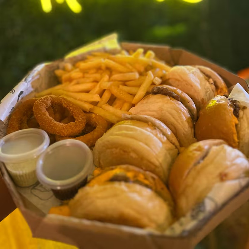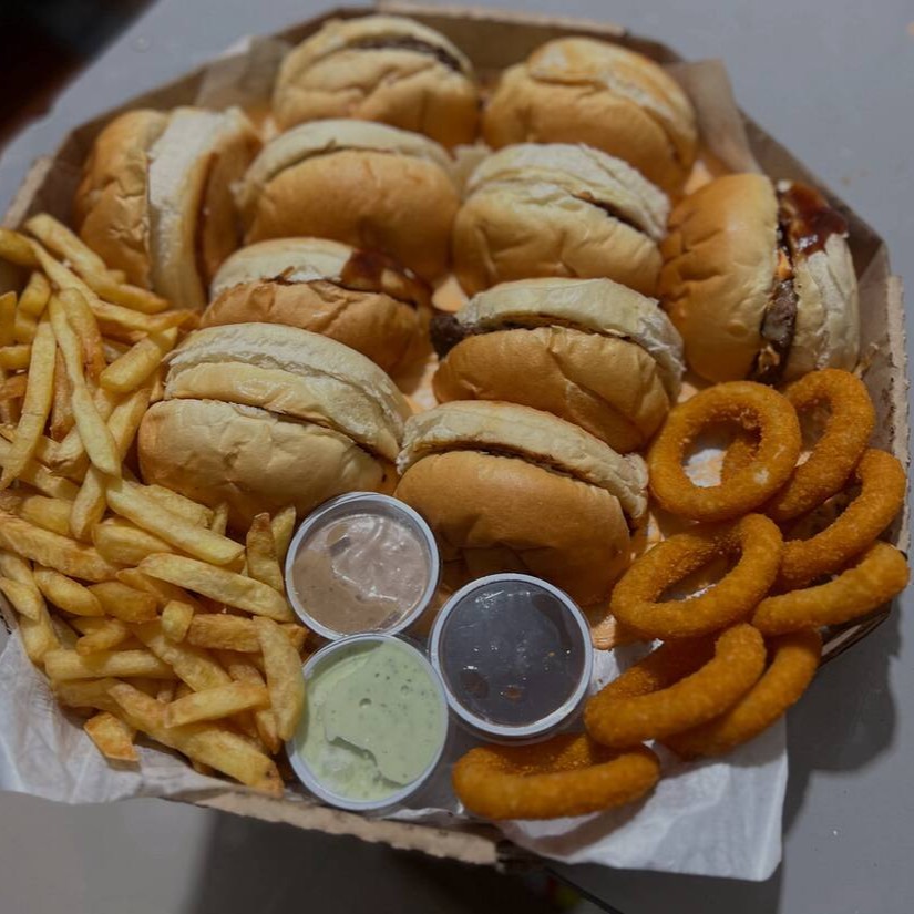 3 Hambúrguer Smash( Pão, Carne Smash Artesanal, Queijo Mussarela e Molhos ) + Porção de Anel de Cebola + Porção de Batata Frita + Pote de Molho Verde + Pote de Barbecue + cheddar na bandeja