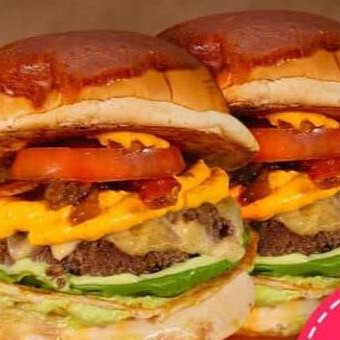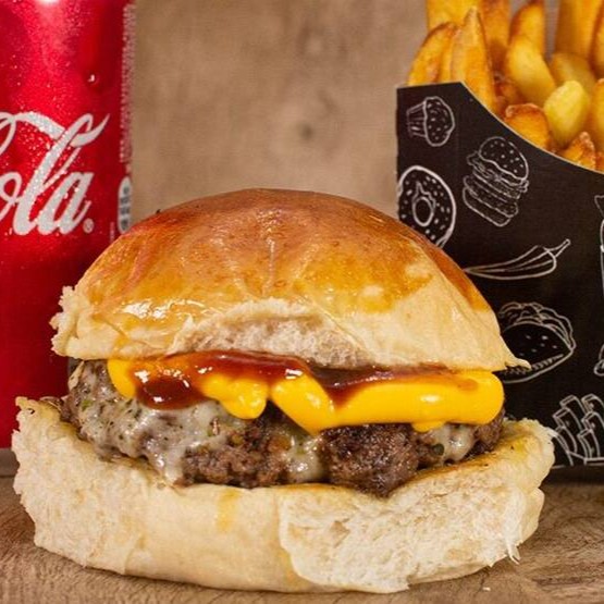 Pão Batata, Carne Smash 50g, Queijo mussarela, Molho Churrasco, Molho Apimentado, Alface e Tomate