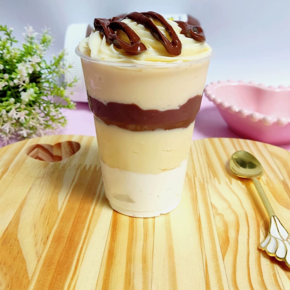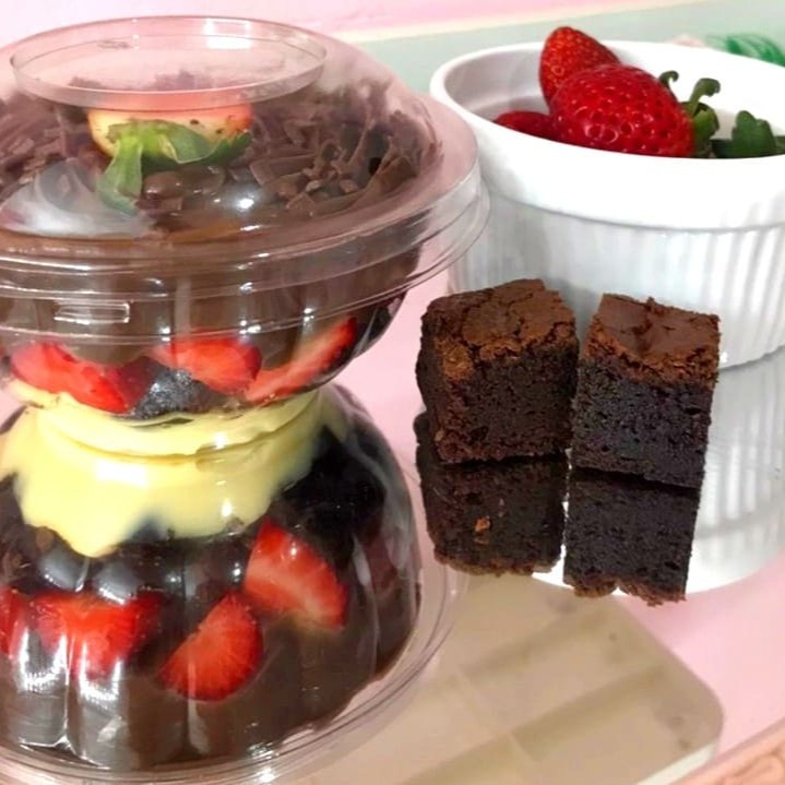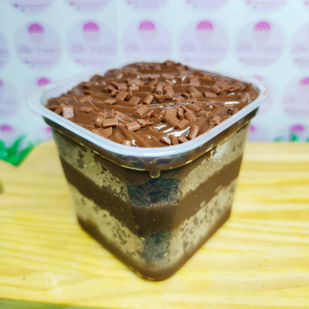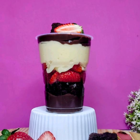 Copo recheado de docura com brigadeiro cremoso de chocolate nobre, pedacos molhadinho de brownie com morango e uma generosa camada de brigadeiro de Ninho, sabor marcante do leite Ninho e finalização de brigadeiro cremoso de chocolate e um pedaco de brownie e morango.