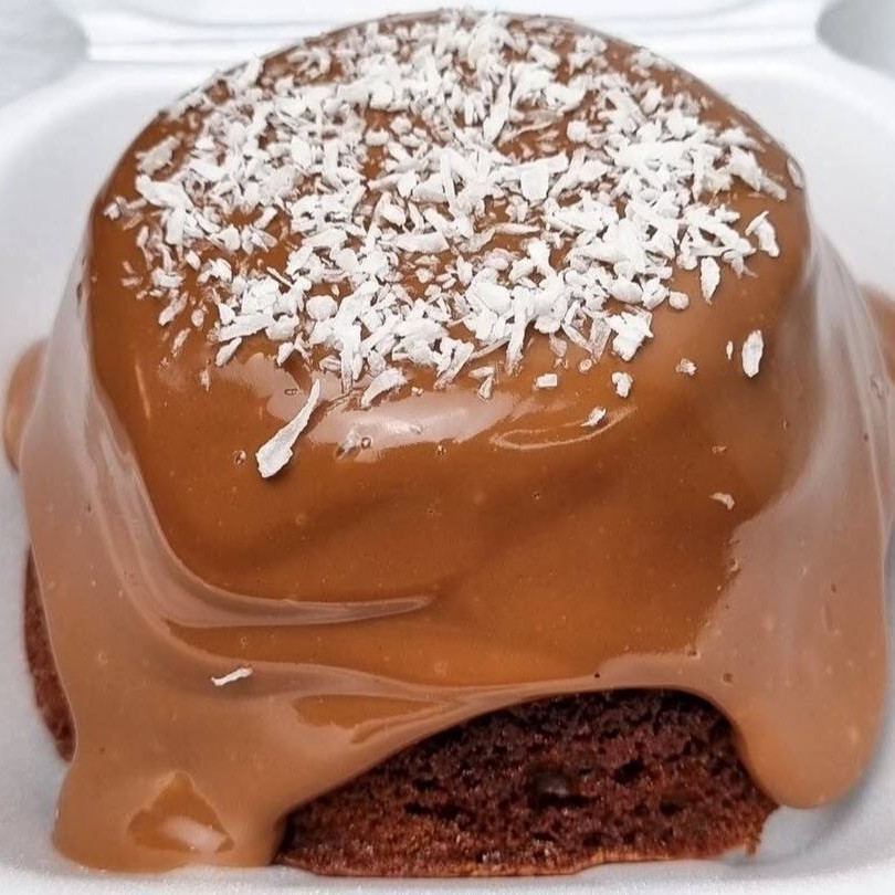 Massa de chocolate caseira super fofinha com cobertura de creme de chocolate e creme de coco finalizado com coco ralado Obs: O creme de coco vai dentro do cone do bolo e a cobertura de creme de chocolate vai por cima do bolo Forma tamanho 12 cm Serve 2 pessoas Peso aproximado 400 gramas #minivulcão, #minibolovulcão, #boloprestígio, #Prestígio Serve 2 pessoas (400g)