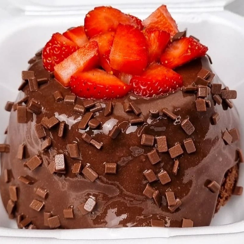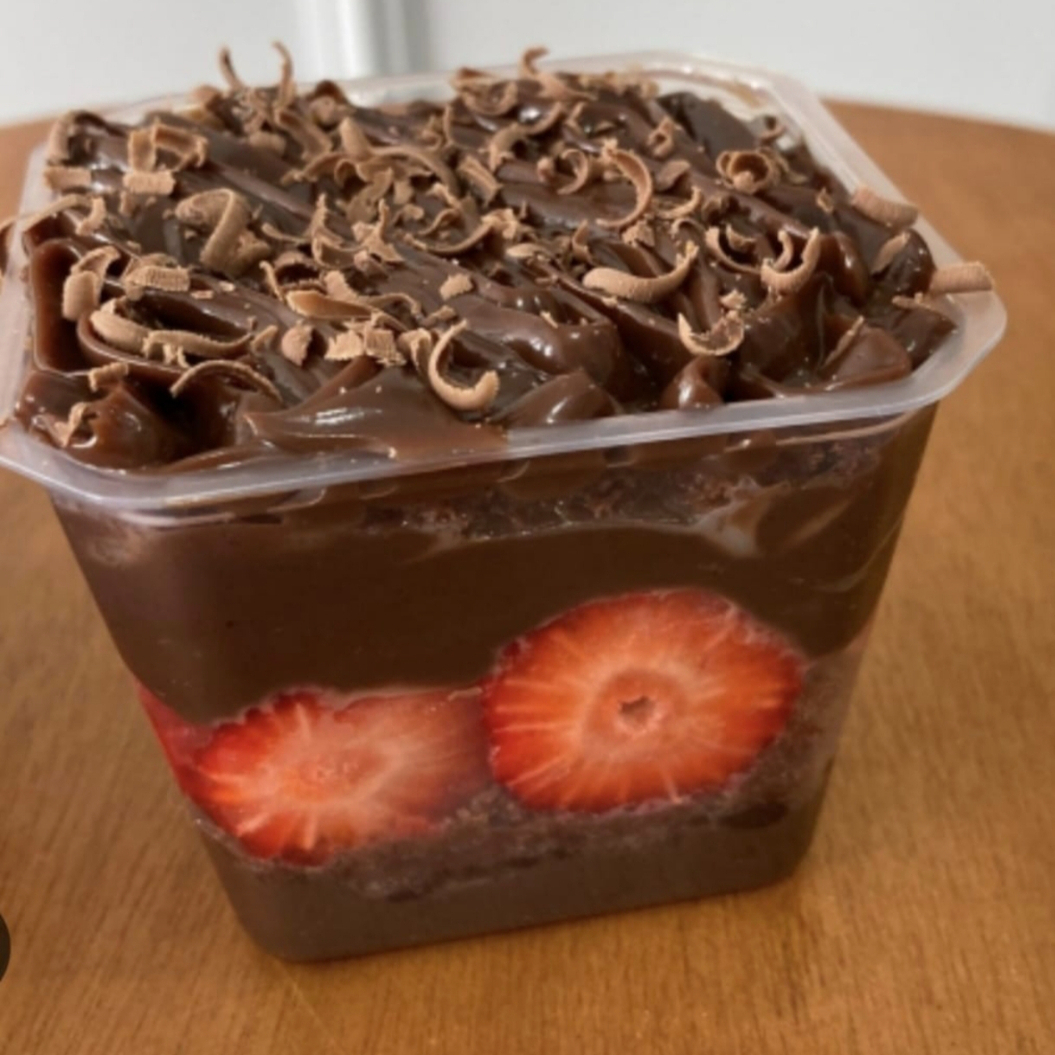 Bolo de chocolate com camadas generosas de recheio de chocolate nobre com pedaços de morangos frescos. Serve 1 pessoa copo 350ml