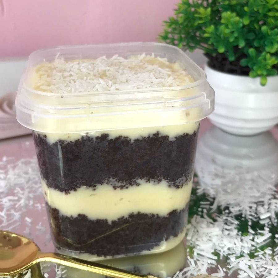 Bolo de chocolate, fofinha, molhadinha, acompanhada de uma camada generosa de recheio delicioso e cremoso de coco, que é de dar agua na boca. Copo de 220ml.