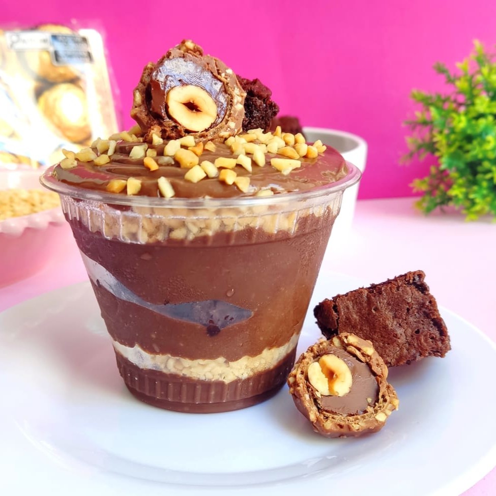Brigadeiro cremoso, amendoim triturado, Creme alpino, pedaços de Brownie, Brigadeiro cremoso, amendoim e creme alpino e a finalização amendoim com bombom ferrero rocher na falta ira brigadeiro ferrero e brownie. 250ml
