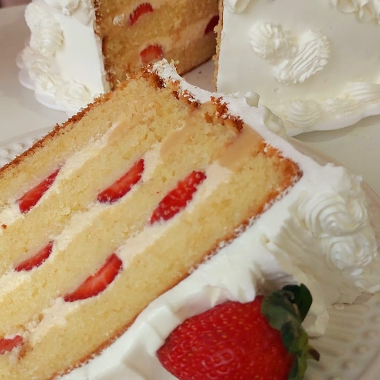 Massa amanteigada branca, com recheio de mousse de Ninho com morangos frescos e uma camada de brigadeiro de Ninho com geleia de morango.