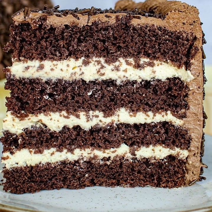 Massa de chocolate 50% bem molhadinha com recheio de Ninho cremoso. Cobertura de brigadeiro de chocolate com Ninho em pó.
