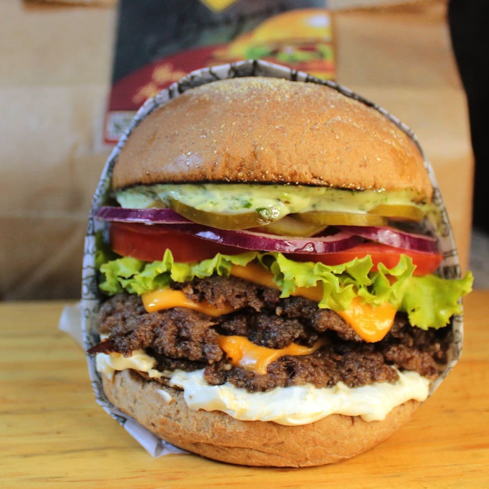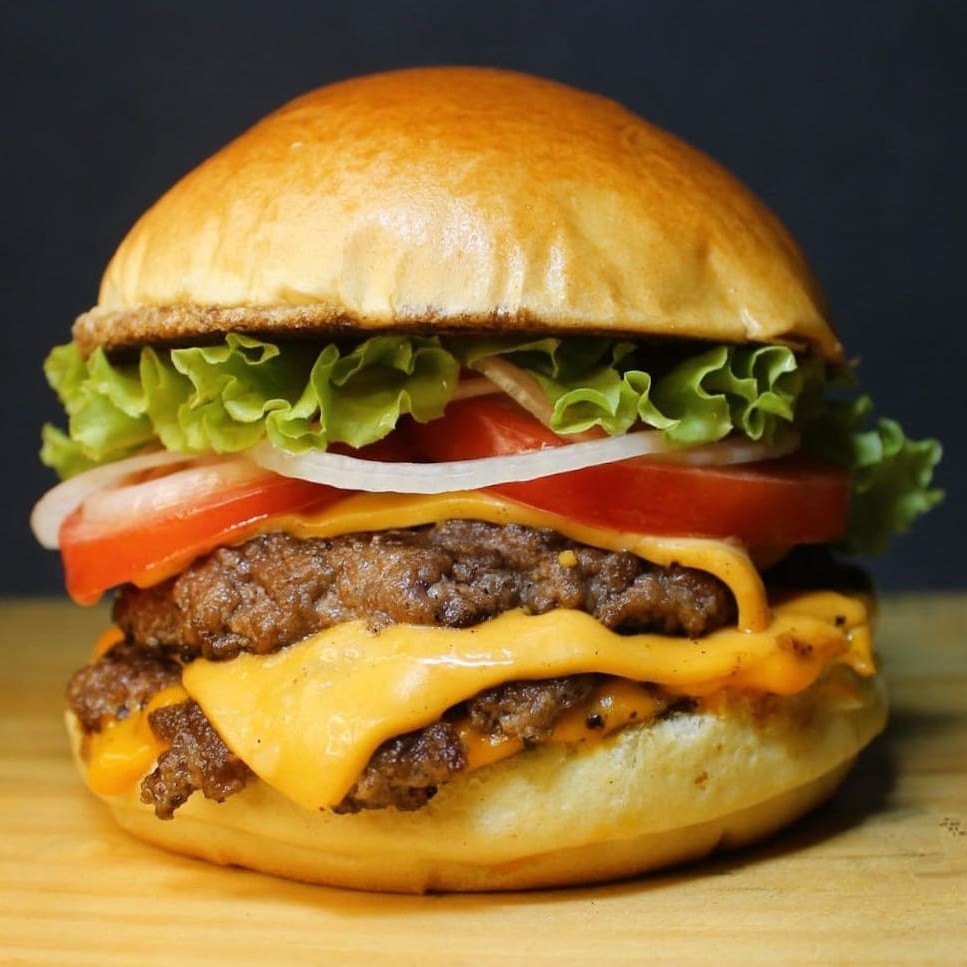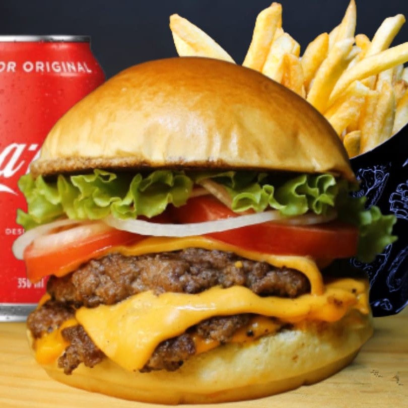 Smash Burguer duplo com salada, tomate cebola, alface e queijo cheddar.
