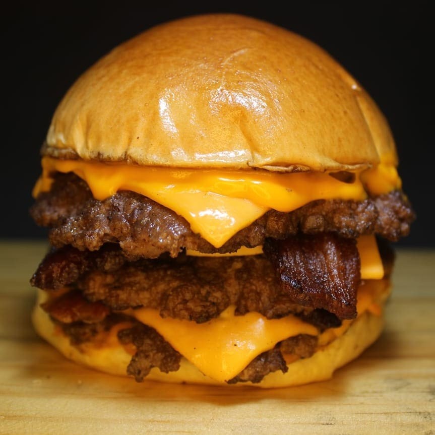 Pão de batata ,Queijo cheddar tres bolinhas de 80g smash e Bacon em todas as camadas.