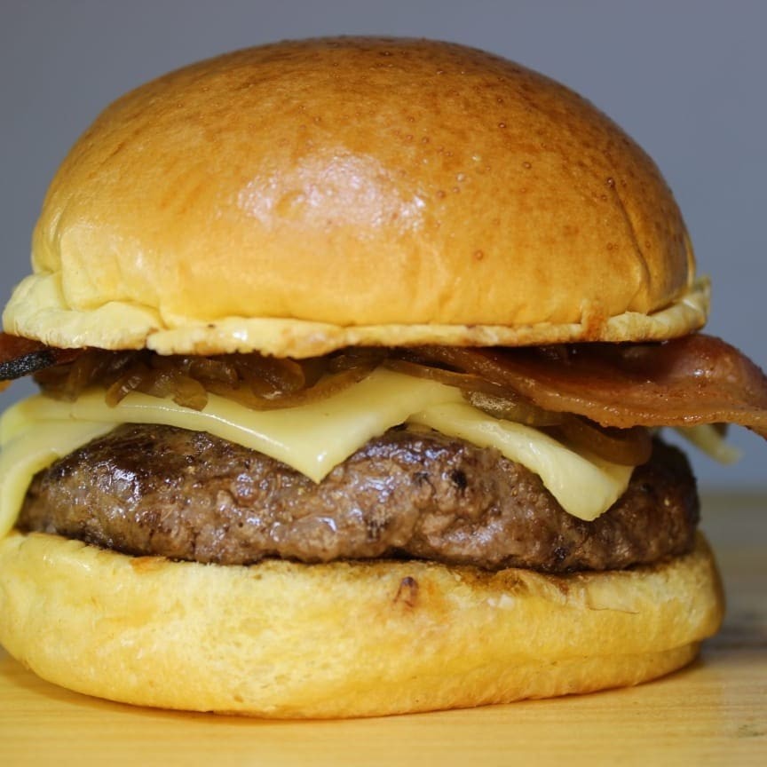 Delicioso pão de batata selado na chapa, blend bovino 150 g, queijo mussarela, cebola caramelizada e bacon.