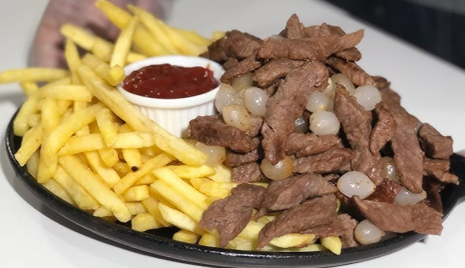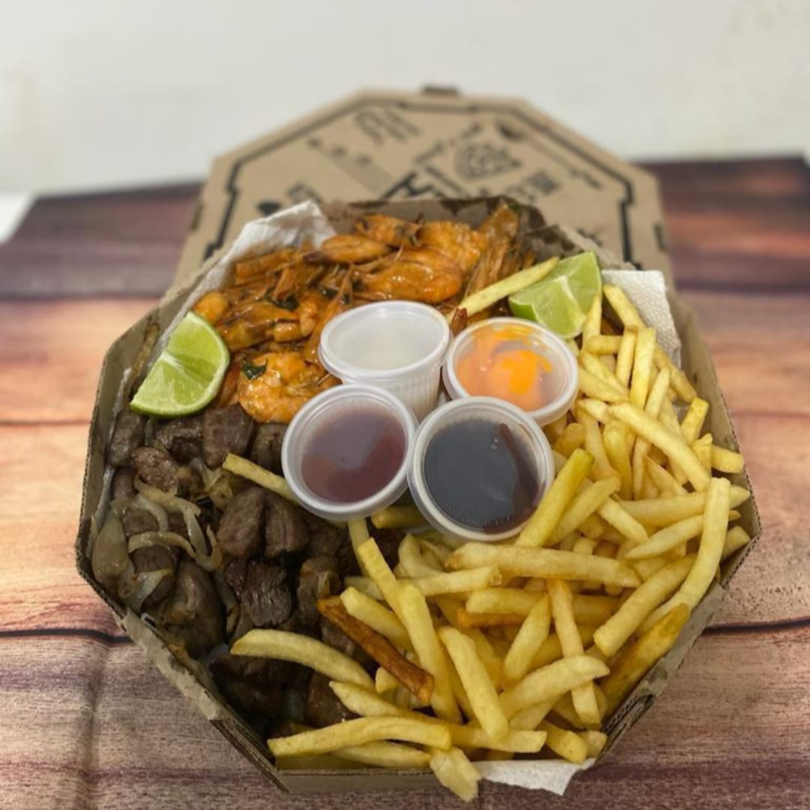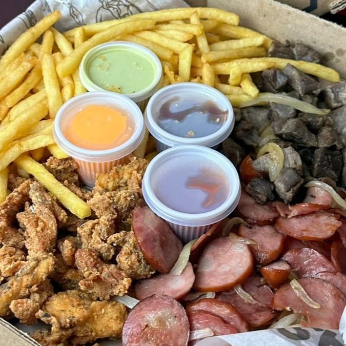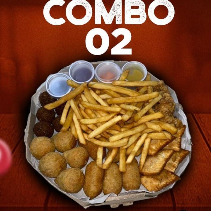 5 coxinhas, 5 quibes, 5 pasteis, 5 croquetes, isca de frango e batata.