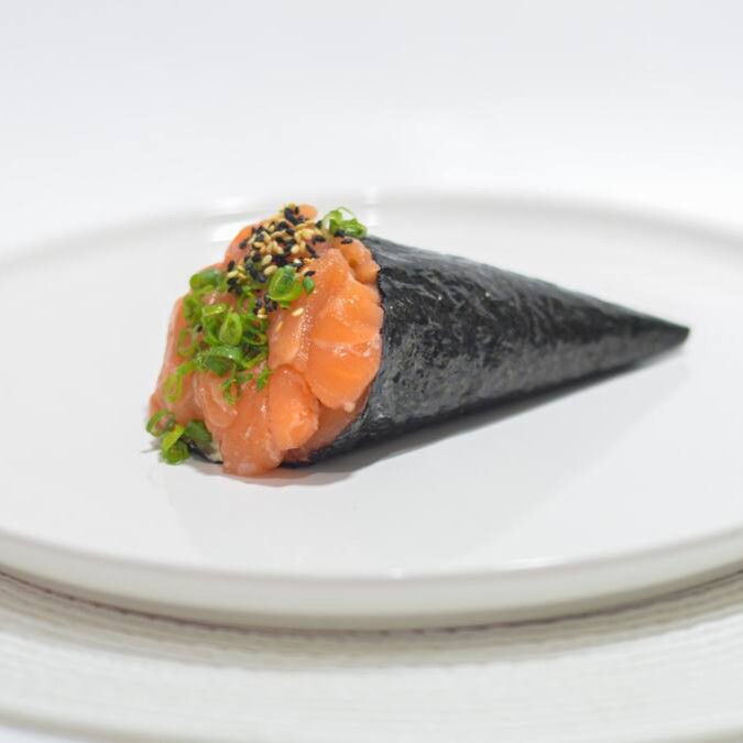 Delicioso e tradicional Temaki de salmão fresco recheado com arroz, creamcheese e cebolinha enrolado em alga