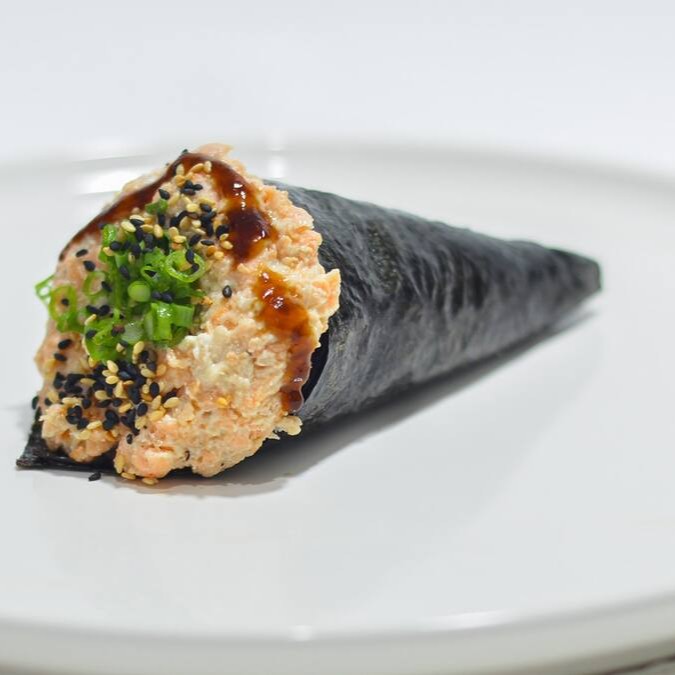 Delicioso Temaki de salmão grelhado, recheado com arroz, creamcheese e cebolinha