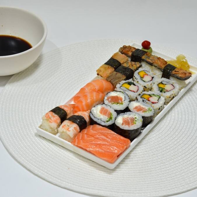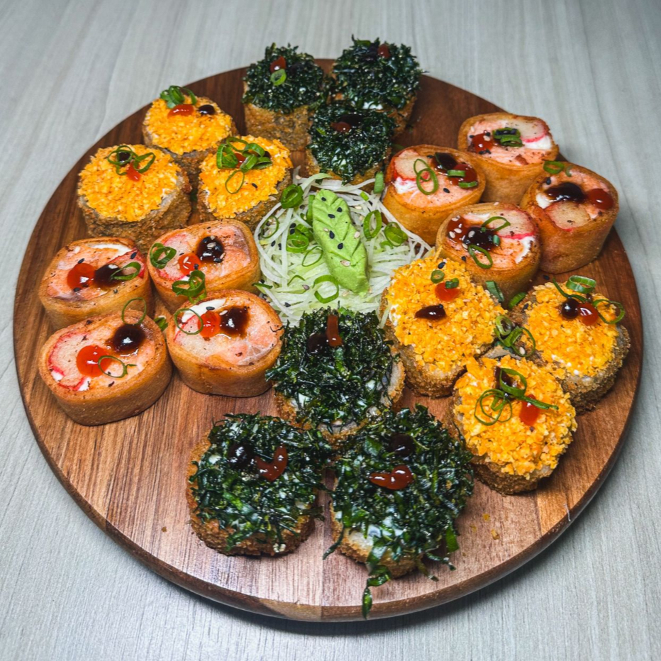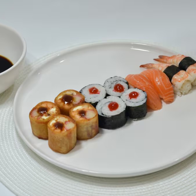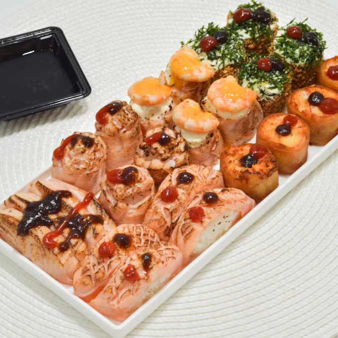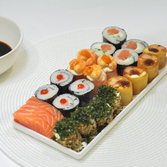 4 hot roll fritos, 4 makimono kani, 2 nigiri de salmão e 2 nigiri camarão.As peças acompanham molho de geleia, teriaky, gergelim e cebolinha.