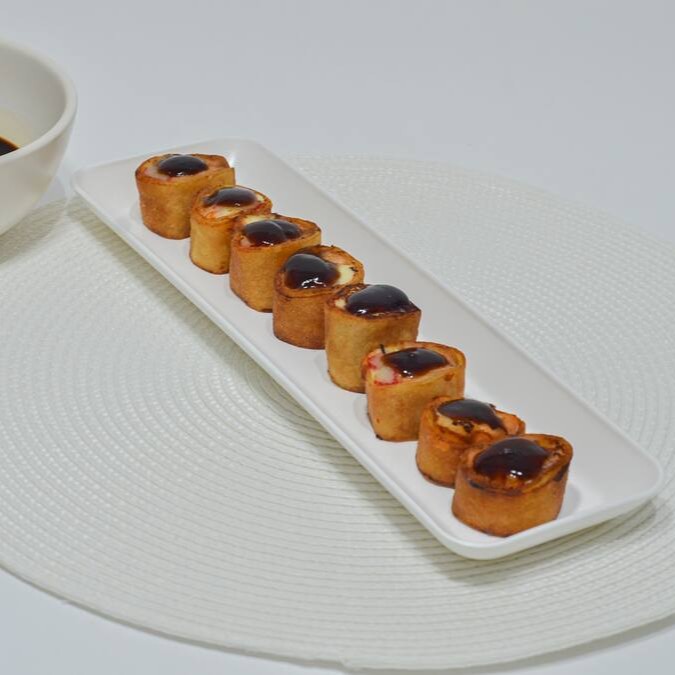 8 deliciosos Haromaki especiais com molho Teriaki recheado com salmão, Kani, camarão e creamcheese