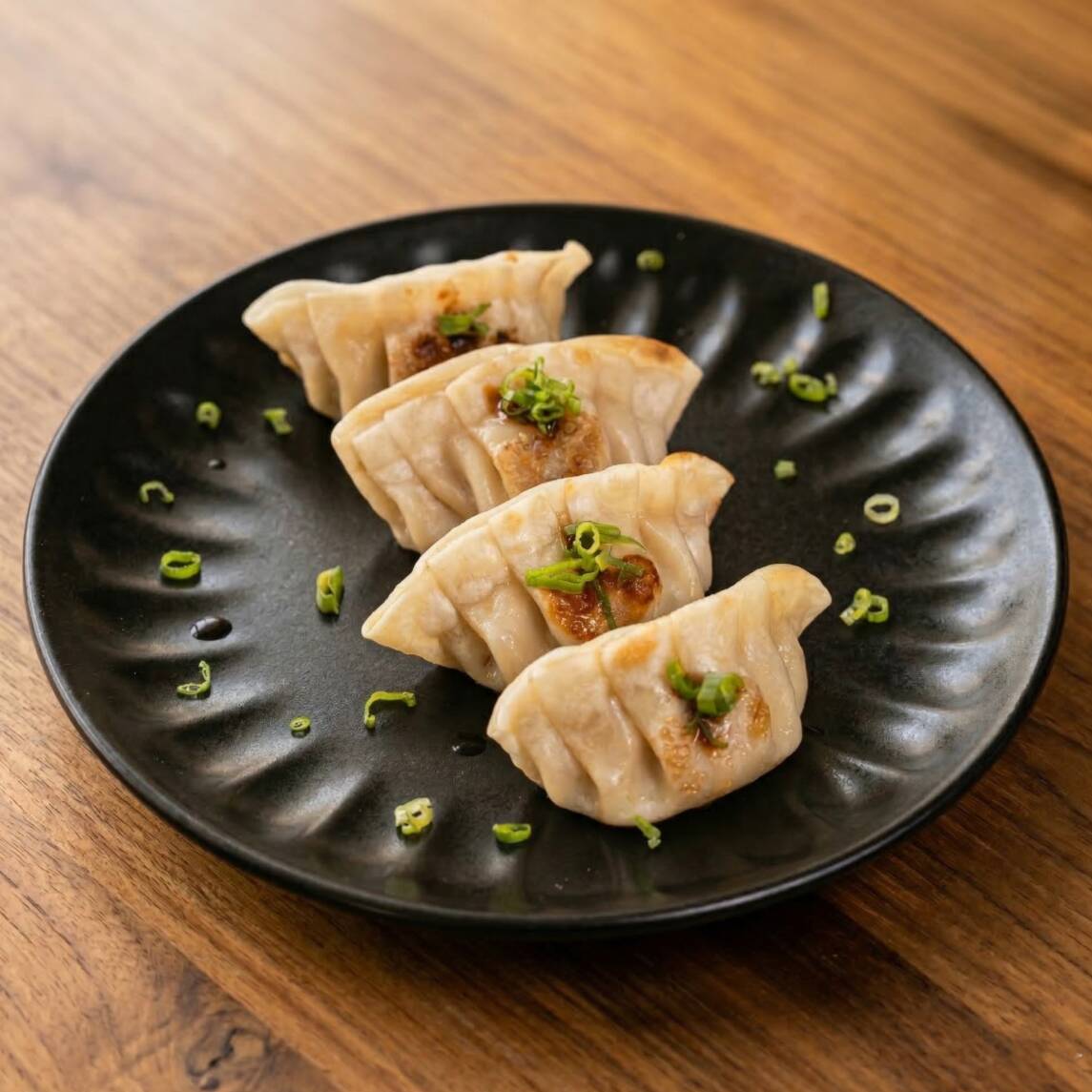 Guiozas suculentas de carne suína, com massa fina e crocante por fora.
