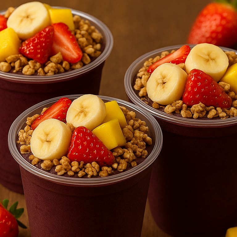 Açaí sem adição de xarope e conservantes. Escolha 5 acompanhamentos grátis + 2 bolas de creme grátis + 2 calda grátis.