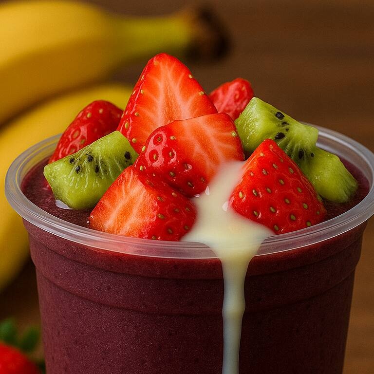 200g de açaí + 200g de creme super cremoso e gostoso + 3 acompanhamentos grátis + 1 calda grátis.
