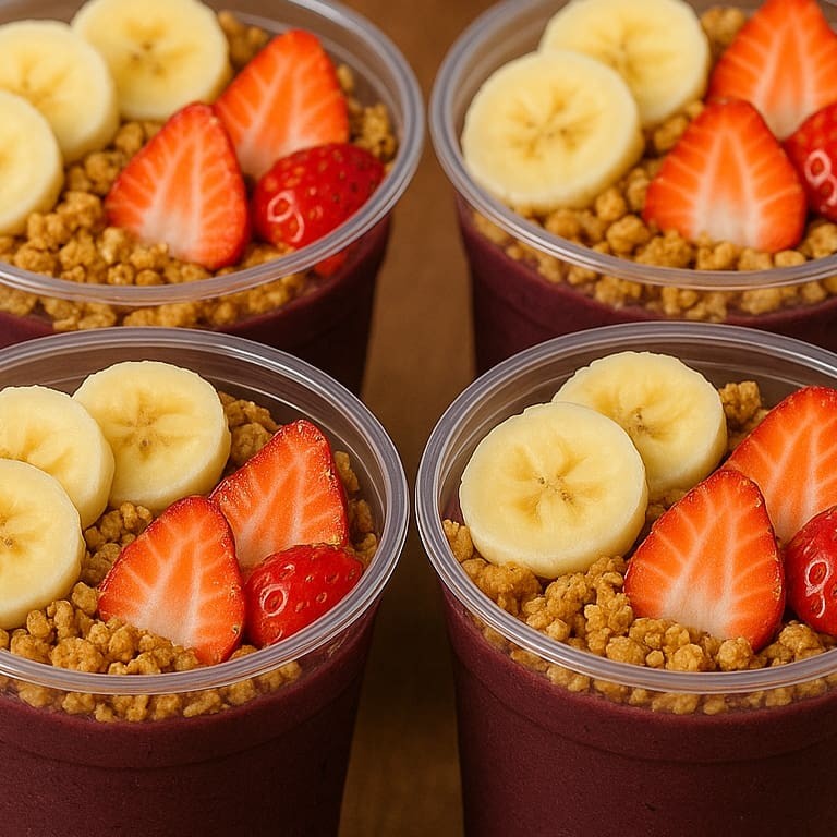 4 açaís de 300ml. Todos os açaís são iguais, os acompanhamentos vão dentro do copo junto com o açaí