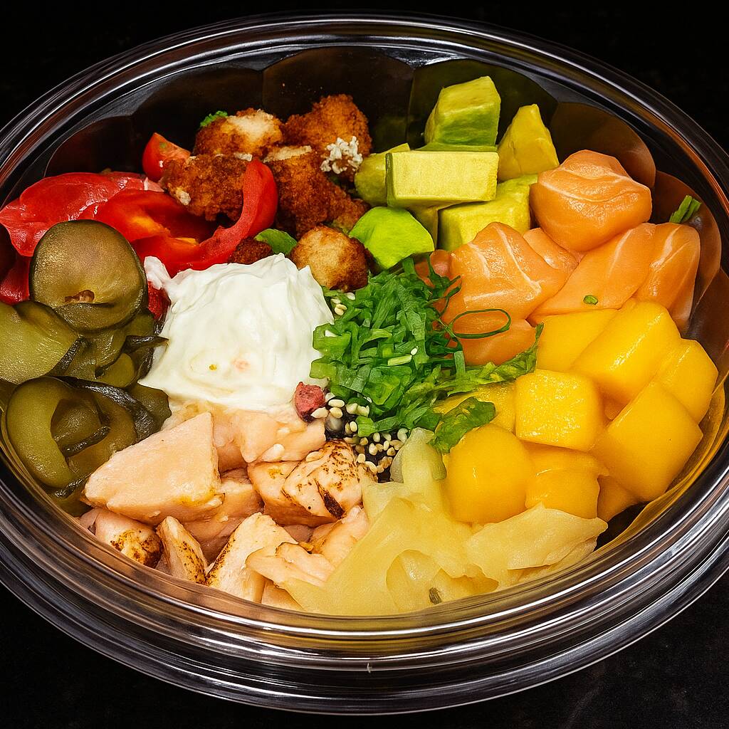 (180G ARROZ, 30G MANGA, 60G SALMÃO CRU, 60G SALMÃO MAÇARICADO, 30G AVOCADO, 20G PICLES DE CEBOLA, 30G TOMATE CEREJA, 20G CREAM CHEESE, 20G GENGIBRE, 20G HURAMAKI CRISPY, 5G CEBOLINHA)