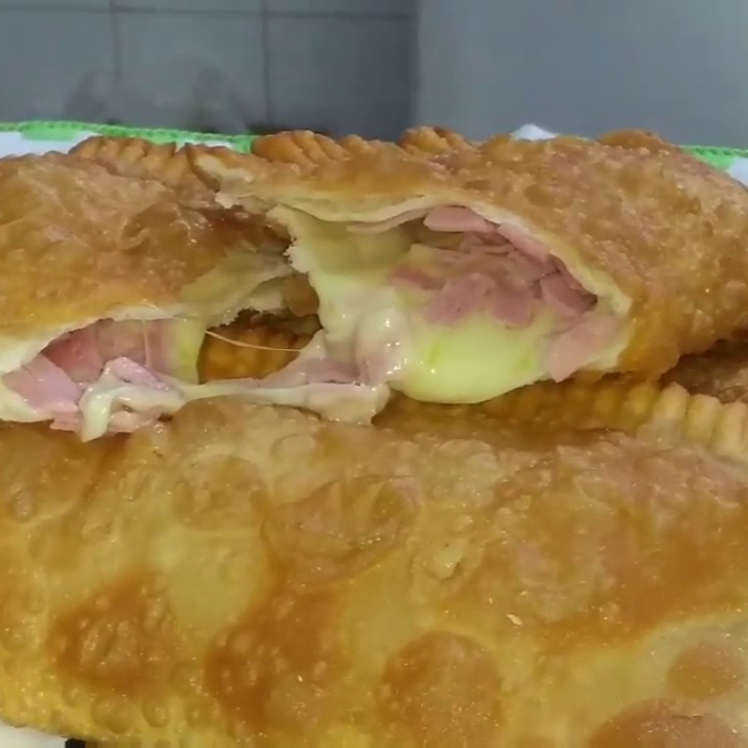 Pastel crocante e dourado, recheado com presunto e queijo derretido, formando uma combinação clássica e deliciosa. Preparado com ingredientes frescos e frito na hora para garantir muito sabor.